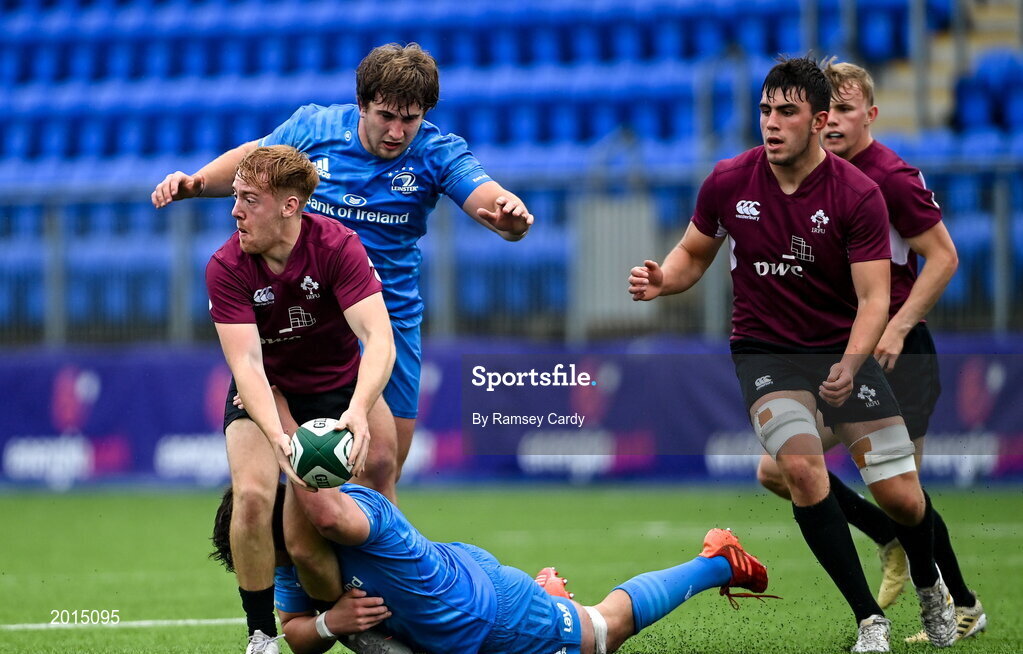 28 May 2021; Cian Whooley of Ireland U20 is tackled by Michael Milne of Leinster A during the match between Ireland U20 and Leinster A at Energia Park in Dublin. Photo by Ramsey Cardy/Sportsfile