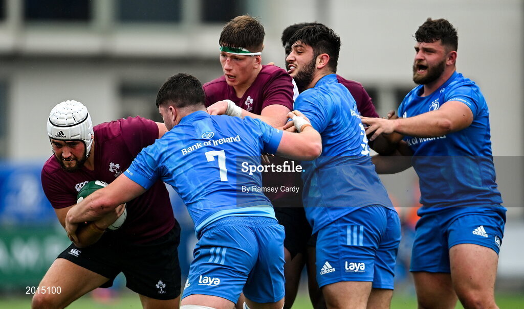 28 May 2021; Ben Carson of Ireland U20 is tackled by Aaron Coleman of Leinster A during the match between Ireland U20 and Leinster A at Energia Park in Dublin. Photo by Ramsey Cardy/Sportsfile