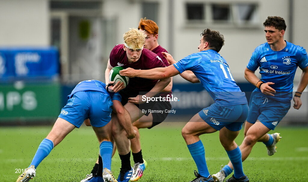 28 May 2021; Jamie Osborne of Ireland U20 in action against David Hawkshaw, left, and Tim Corkery of Leinster A during the match between Ireland U20 and Leinster A at Energia Park in Dublin. Photo by Ramsey Cardy/Sportsfile