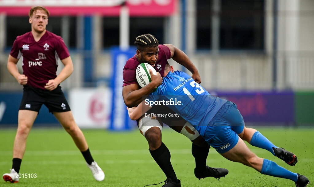 28 May 2021; Daniel Okeke of Ireland U20 is tackled by Marcus Kiely of Leinster A during the match between Ireland U20 and Leinster A at Energia Park in Dublin. Photo by Ramsey Cardy/Sportsfile