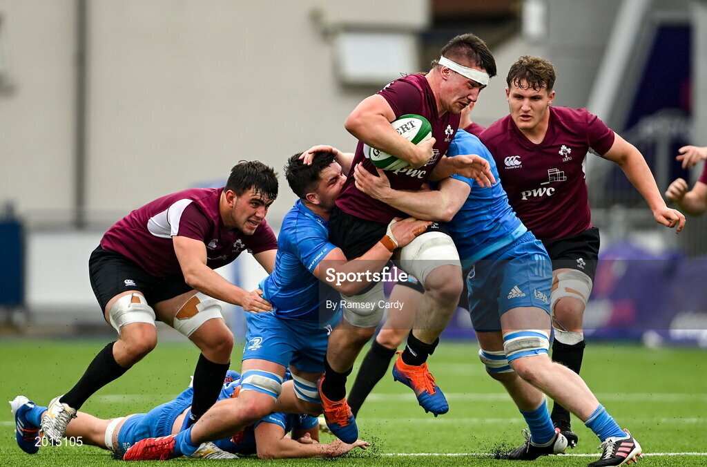 28 May 2021; Harry Sheridan of Ireland U20 is tackled by Aaron Coleman, left, and Martin Moloney of Leinster A during the match between Ireland U20 and Leinster A at Energia Park in Dublin. Photo by Ramsey Cardy/Sportsfile