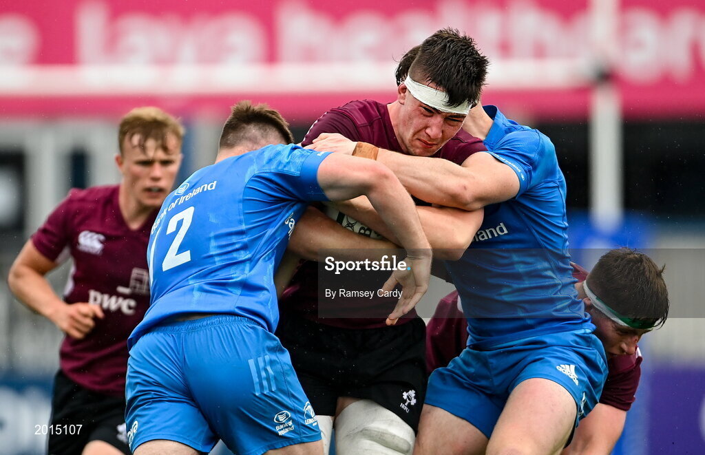 28 May 2021; Harry Sheridan of Ireland U20 is tackled by David Hawkshaw, left, and Marcus Kiely of Leinster A during the match between Ireland U20 and Leinster A at Energia Park in Dublin. Photo by Ramsey Cardy/Sportsfile