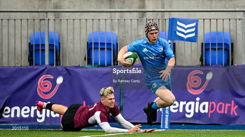 28 May 2021; Donal Conroy of Leinster A on his way to scoring his side's second try despite the tackle of Alan Flannery of Ireland U20 during the match between Ireland U20 and Leinster A at Energia Park in Dublin. Photo by Ramsey Cardy/Sportsfile