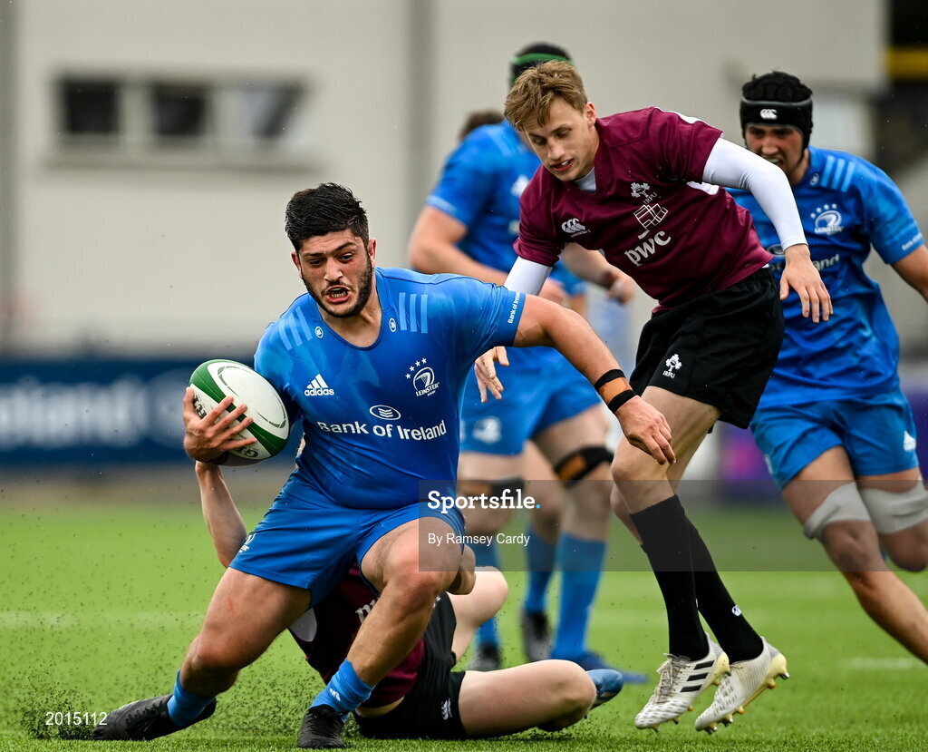28 May 2021; Vakh Abdaladze of Leinster A is tackled by Conor McKee of Ireland U20 during the match between Ireland U20 and Leinster A at Energia Park in Dublin. Photo by Ramsey Cardy/Sportsfile