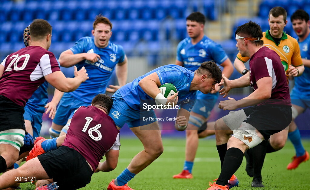 28 May 2021; Dan Sheehan of Leinster A is tackled by Eoin de Buitlear of Ireland U20 during the match between Ireland U20 and Leinster A at Energia Park in Dublin. Photo by Ramsey Cardy/Sportsfile