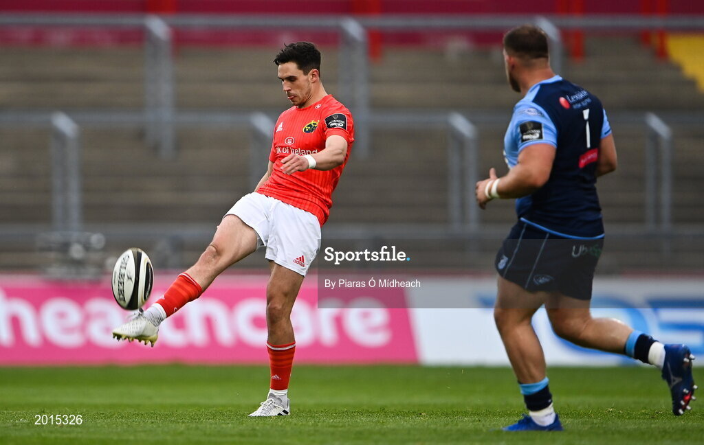 28 May 2021; Joey Carbery of Munster kicks as Corey Domachowski of Cardiff Blues closes in during the Guinness PRO14 Rainbow Cup match between Munster and Cardiff Blues at Thomond Park in Limerick. Photo by Piaras Ó Mídheach/Sportsfile