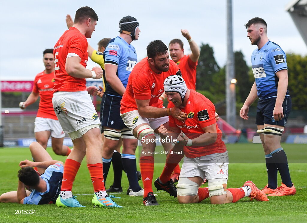28 May 2021; Fineen Wycherley of Munster celebrates scoring his side's second try during the Guinness PRO14 Rainbow Cup match between Munster and Cardiff Blues at Thomond Park in Limerick. Photo by Piaras Ó Mídheach/Sportsfile