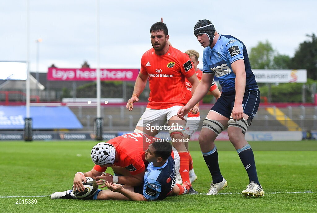 28 May 2021; Fineen Wycherley of Munster scores his side's second try, despite the efforts of Tomos Williams of Cardiff Blues, during the Guinness PRO14 Rainbow Cup match between Munster and Cardiff Blues at Thomond Park in Limerick. Photo by Piaras Ó Mídheach/Sportsfile