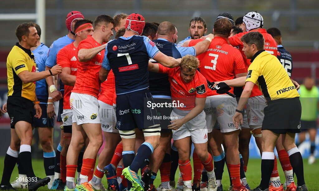 28 May 2021; Munster and Cardiff Blues players tussle during the Guinness PRO14 Rainbow Cup match between Munster and Cardiff Blues at Thomond Park in Limerick. Photo by Matt Browne/Sportsfile