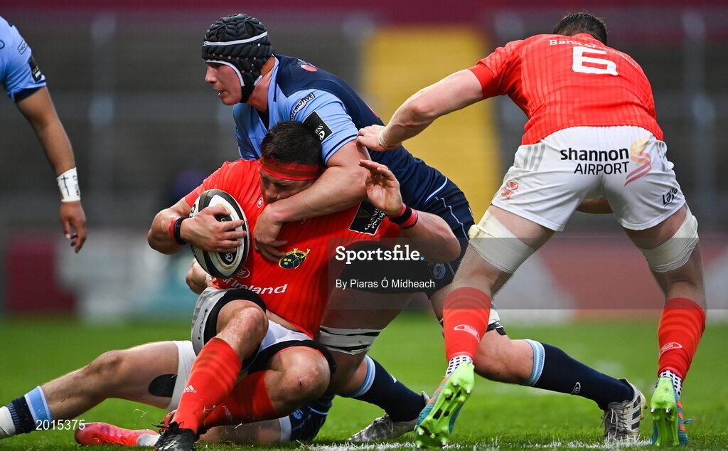 28 May 2021; CJ Stander of Munster is tackled by Olly Robinson of Cardiff Blues during the Guinness PRO14 Rainbow Cup match between Munster and Cardiff Blues at Thomond Park in Limerick. Photo by Piaras Ó Mídheach/Sportsfile