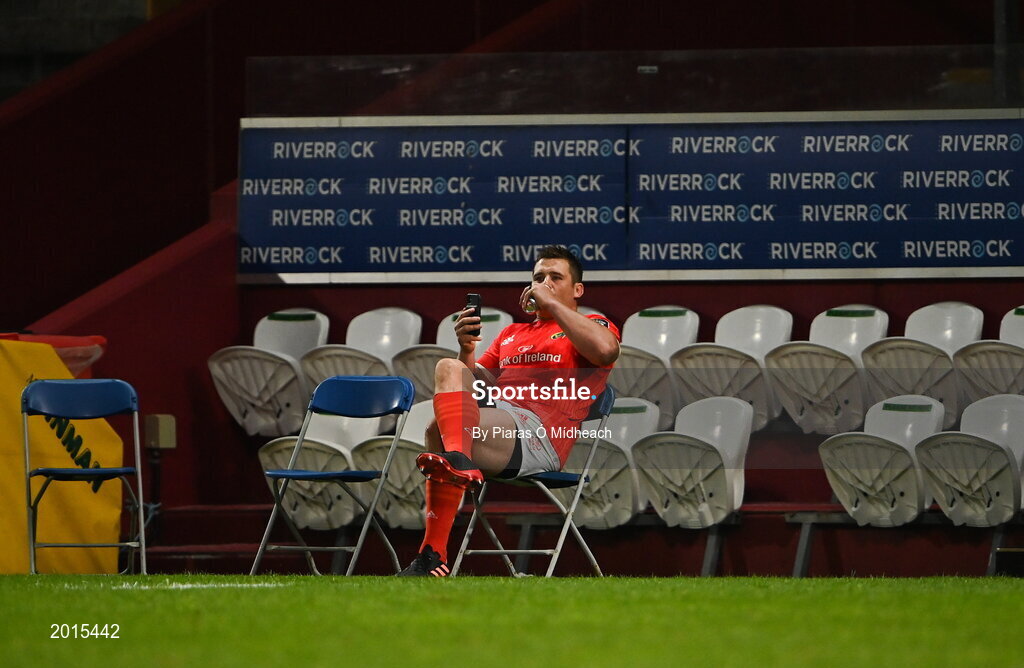 28 May 2021; CJ Stander on the phone pitchside after playing his last game for Munster at Thomond Park at the Guinness PRO14 Rainbow Cup match between Munster and Cardiff Blues at Thomond Park in Limerick. Photo by Piaras Ó Mídheach/Sportsfile