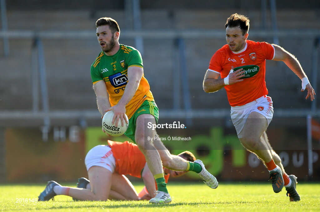 29 May 2021; Eoghan Bán Gallagher of Donegal gets past Ross Finn of Armagh during the Allianz Football League Division 1 North Round 3 match between Armagh and Donegal at the Athletic Grounds in Armagh. Photo by Piaras Ó Mídheach/Sportsfile
