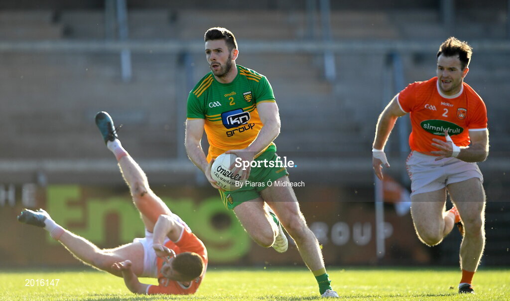 29 May 2021; Eoghan Bán Gallagher of Donegal gets past Ross McQuillan, left, and Ross Finn of Armagh during the Allianz Football League Division 1 North Round 3 match between Armagh and Donegal at the Athletic Grounds in Armagh. Photo by Piaras Ó Mídheach/Sportsfile