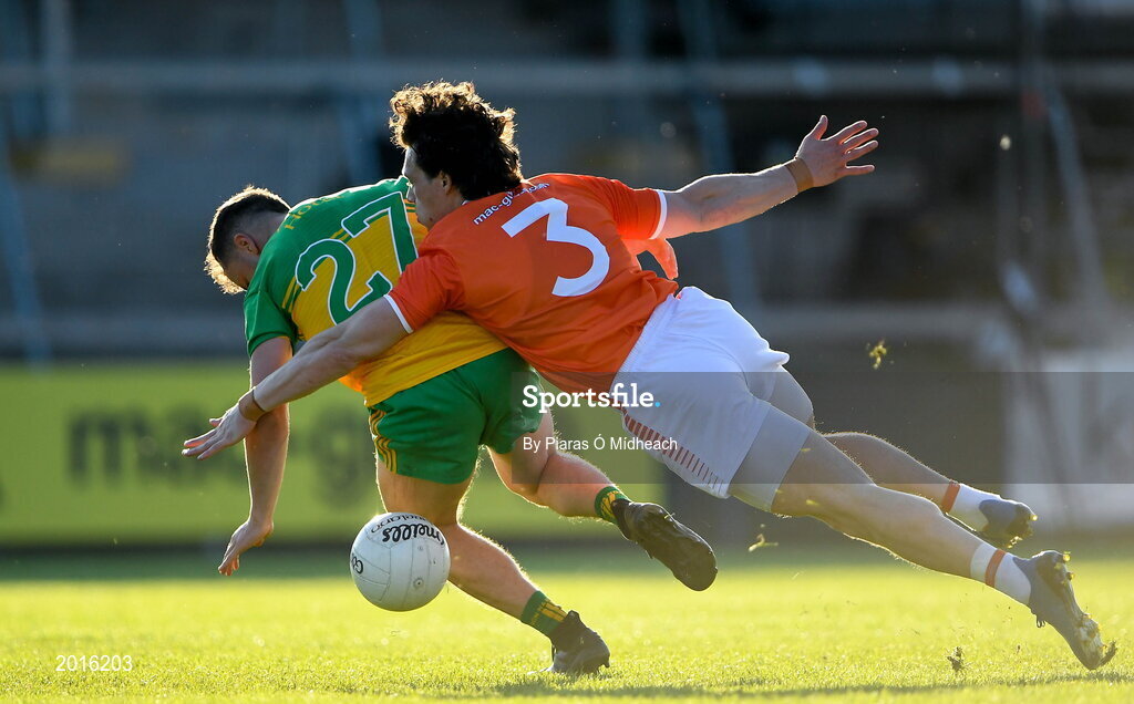 29 May 2021; Eoghan McGettigan of Donegal is tackled by James Morgan of Armagh during the Allianz Football League Division 1 North Round 3 match between Armagh and Donegal at the Athletic Grounds in Armagh. Photo by Piaras Ó Mídheach/Sportsfile