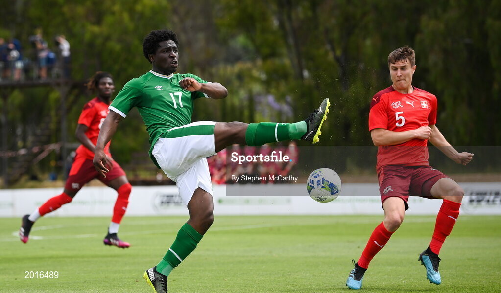 30 May 2021; Festy Ebosele of Republic of Ireland in action against Marco Burch of Switzerland during the U21 international friendly match between Switzerland and Republic of Ireland at Dama de Noche Football Centre in Marbella, Spain. Photo by Stephen McCarthy/Sportsfile