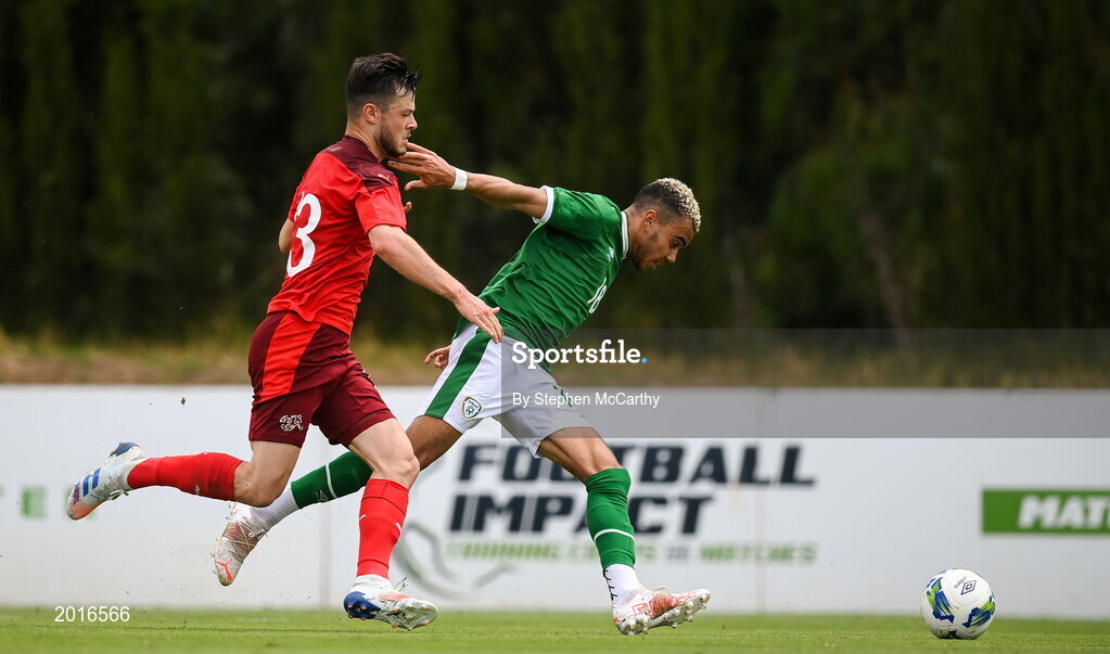 30 May 2021; Tyreik Wright of Republic of Ireland in action against Adrian Gantenbein of Switzerland during the U21 international friendly match between Switzerland and Republic of Ireland at Dama de Noche Football Centre in Marbella, Spain. Photo by Stephen McCarthy/Sportsfile