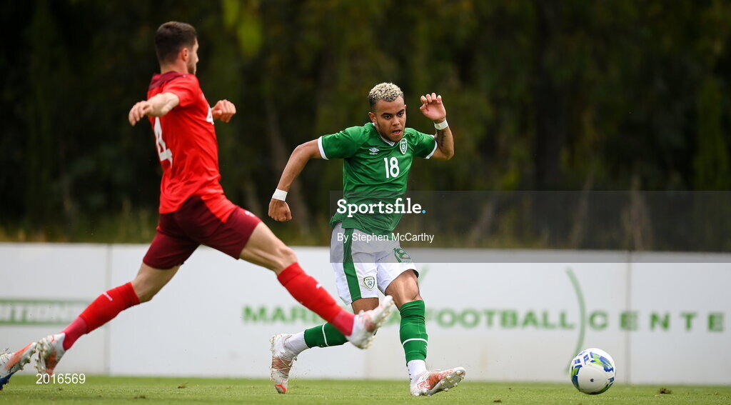 30 May 2021; Tyreik Wright of Republic of Ireland in action against Leonidas Stergiou of Switzerland during the U21 international friendly match between Switzerland and Republic of Ireland at Dama de Noche Football Centre in Marbella, Spain. Photo by Stephen McCarthy/Sportsfile