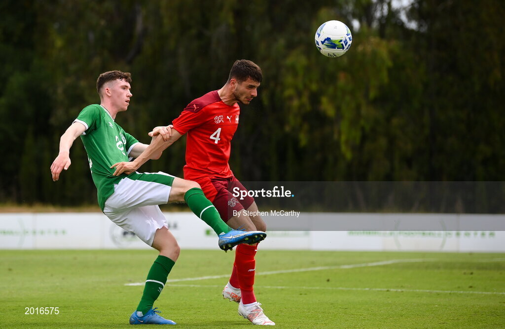 30 May 2021; Conor Grant of Republic of Ireland in action against Leonidas Stergiou of Switzerland during the U21 international friendly match between Switzerland and Republic of Ireland at Dama de Noche Football Centre in Marbella, Spain. Photo by Stephen McCarthy/Sportsfile
