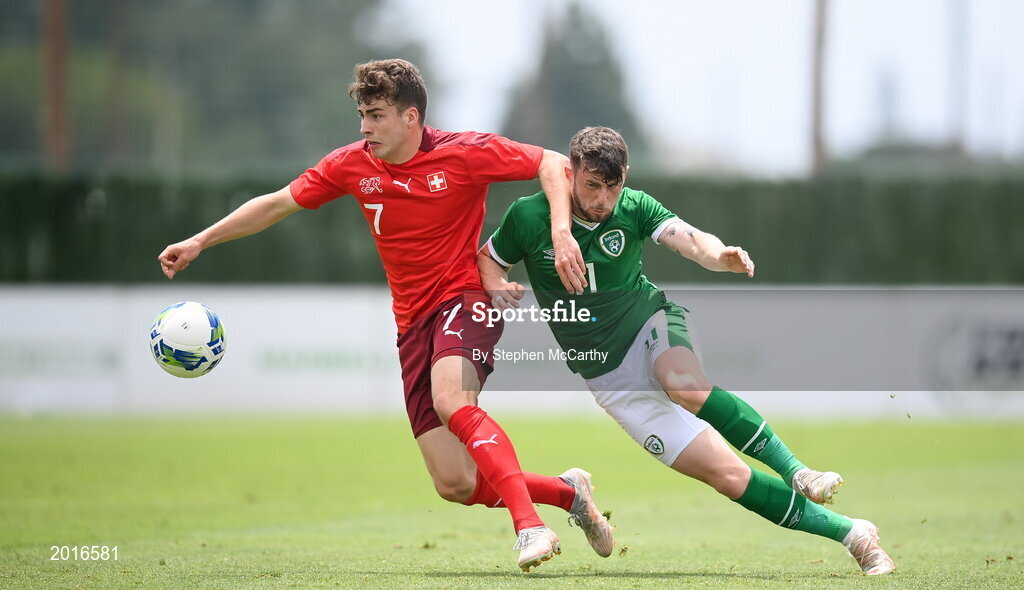 30 May 2021; Tim Staubli of Switzerland in action against Will Ferry of Republic of Ireland during the U21 international friendly match between Switzerland and Republic of Ireland at Dama de Noche Football Centre in Marbella, Spain. Photo by Stephen McCarthy/Sportsfile