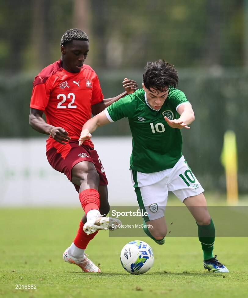 30 May 2021; Louie Watson of Republic of Ireland in action against Christopher Lungoyi of Switzerland during the U21 international friendly match between Switzerland and Republic of Ireland at Dama de Noche Football Centre in Marbella, Spain. Photo by Stephen McCarthy/Sportsfile