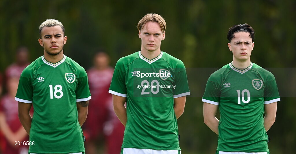 30 May 2021; Republic of Ireland players, from left, Tyreik Wright, Ryan Johansson and Louie Watson stand for the playing of the National Anthem before the U21 international friendly match between Switzerland and Republic of Ireland at Dama de Noche Football Centre in Marbella, Spain. Photo by Stephen McCarthy/Sportsfile