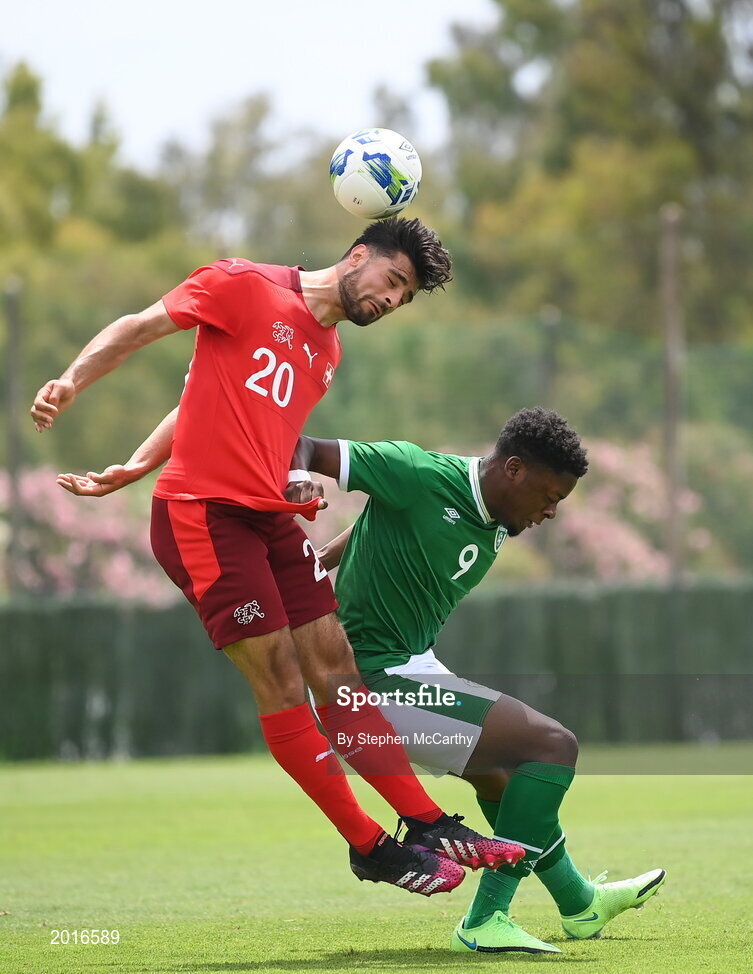 30 May 2021; Nicholas Vouilloz of Switzerland in action against Jonathan Afolabi of Republic of Ireland during the U21 international friendly match between Switzerland and Republic of Ireland at Dama de Noche Football Centre in Marbella, Spain. Photo by Stephen McCarthy/Sportsfile