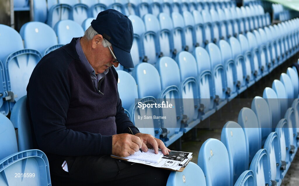 30 May 2021; Stadium announcer John Hopkins finalises his notes before the Allianz Football League Division 2 North Round 3 match between Mayo and Meath at Elverys MacHale Park in Castlebar, Mayo. Photo by Sam Barnes/Sportsfile