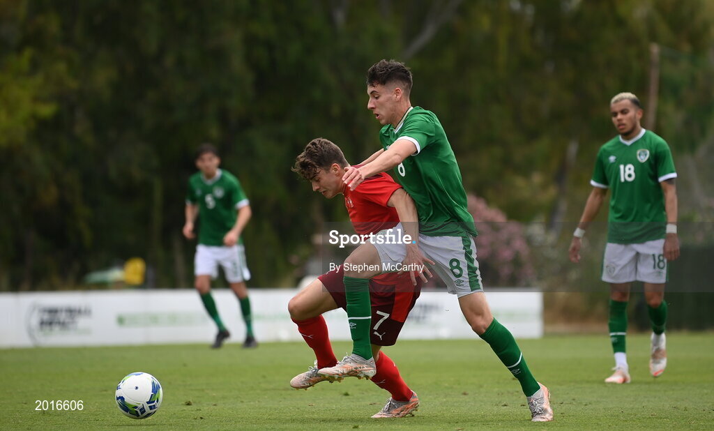 30 May 2021; Tim Staubli of Switzerland and Conor Noss of Republic of Ireland during the U21 international friendly match between Switzerland and Republic of Ireland at Dama de Noche Football Centre in Marbella, Spain. Photo by Stephen McCarthy/Sportsfile
