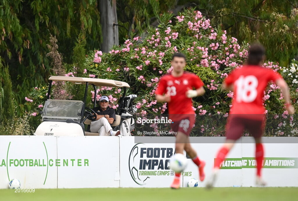 30 May 2021; A golfer stops to take in the U21 international friendly match between Switzerland and Republic of Ireland at Dama de Noche Football Centre in Marbella, Spain. Photo by Stephen McCarthy/Sportsfile