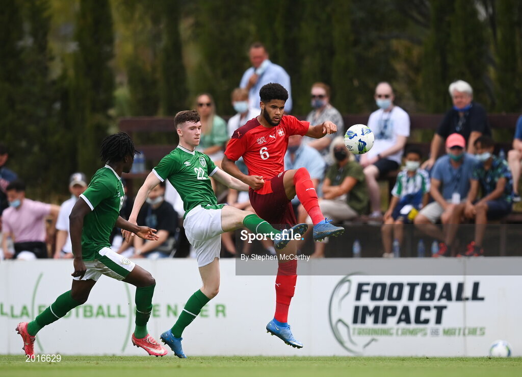 30 May 2021; Simon Sahm of Switzerland in action against Conor Grant of Republic of Ireland during the U21 international friendly match between Switzerland and Republic of Ireland at Dama de Noche Football Centre in Marbella, Spain. Photo by Stephen McCarthy/Sportsfile