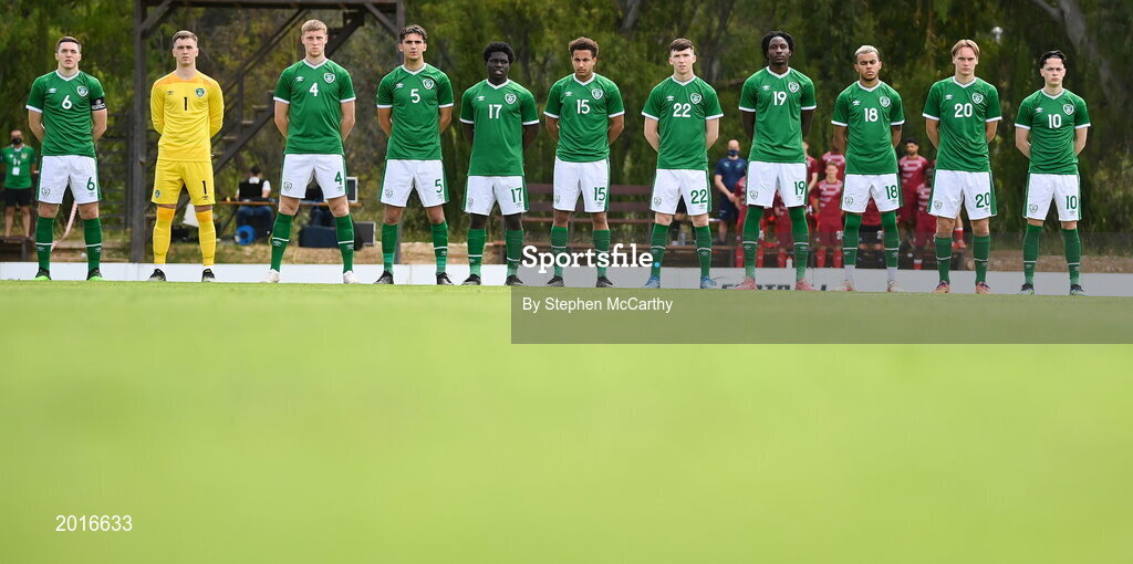 30 May 2021; Republic of Ireland players stand for the playing of the National Anthem before the U21 international friendly match between Switzerland and Republic of Ireland at Dama de Noche Football Centre in Marbella, Spain. Photo by Stephen McCarthy/Sportsfile