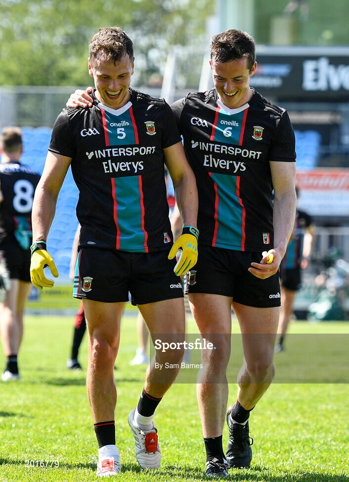 30 May 2021; Mayo players Michael Plunkett, left, and Stephen Coen, share a joke after the Allianz Football League Division 2 North Round 3 match between Mayo and Meath at Elverys MacHale Park in Castlebar, Mayo. Photo by Sam Barnes/Sportsfile