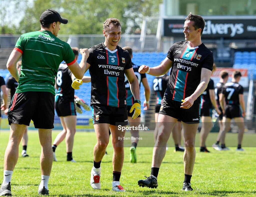 30 May 2021; Mayo players including Michael Plunkett, second from left, and Stephen Coen, right, share a joke after the Allianz Football League Division 2 North Round 3 match between Mayo and Meath at Elverys MacHale Park in Castlebar, Mayo. Photo by Sam Barnes/Sportsfile