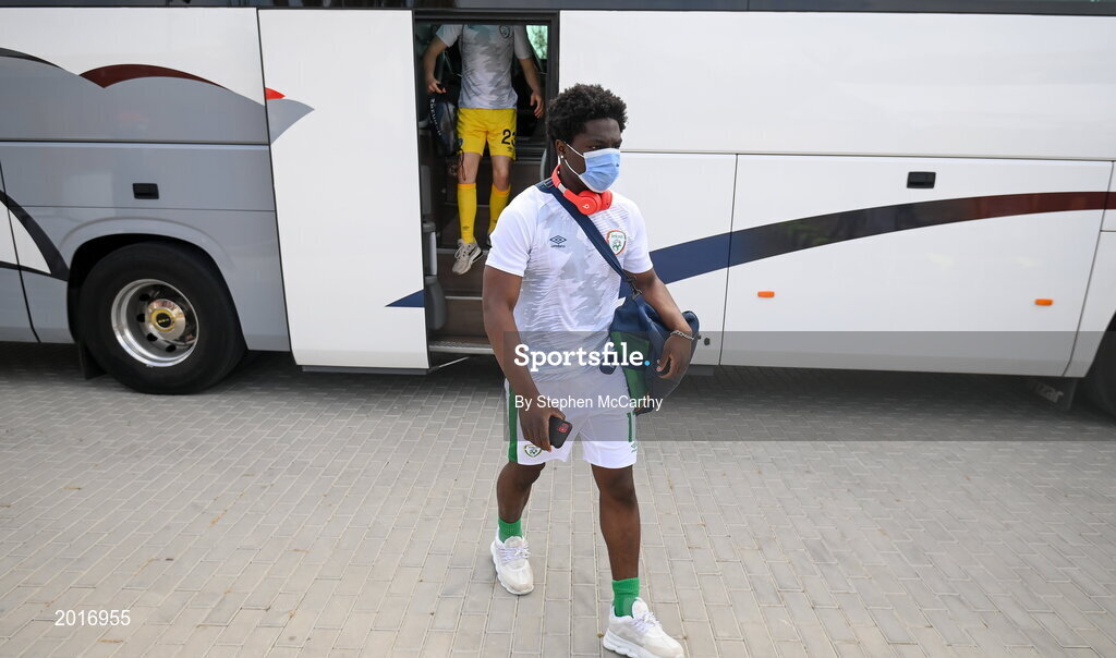 30 May 2021; Festy Ebosele of Republic of Ireland arrives before the U21 international friendly match between Switzerland and Republic of Ireland at Dama de Noche Football Centre in Marbella, Spain. Photo by Stephen McCarthy/Sportsfile