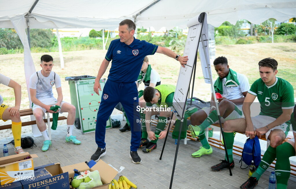 30 May 2021; Republic of Ireland manager Jim Crawford speaks to his players before the U21 international friendly match between Switzerland and Republic of Ireland at Dama de Noche Football Centre in Marbella, Spain. Photo by Stephen McCarthy/Sportsfile