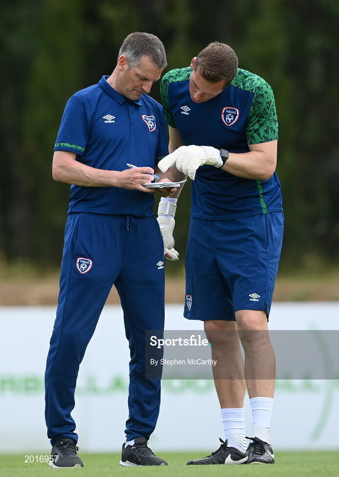 30 May 2021; Republic of Ireland manager Jim Crawford and goalkeeping coach Rene Gilmartin before the U21 international friendly match between Switzerland and Republic of Ireland at Dama de Noche Football Centre in Marbella, Spain. Photo by Stephen McCarthy/Sportsfile