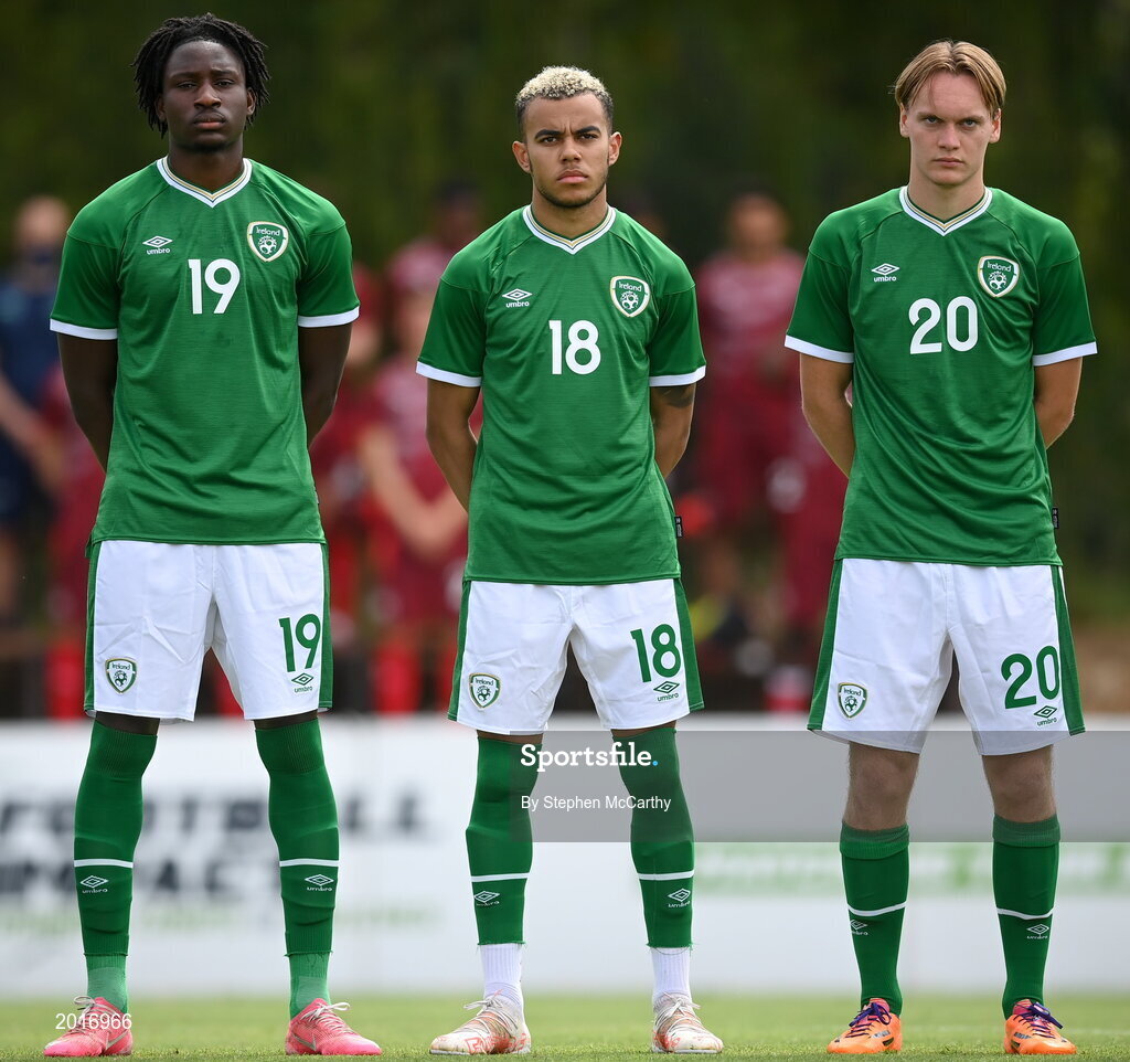30 May 2021; Republic of Ireland players, from left, Joshua Kayode, Tyreik Wright and Ryan Johansson before the U21 international friendly match between Switzerland and Republic of Ireland at Dama de Noche Football Centre in Marbella, Spain. Photo by Stephen McCarthy/Sportsfile