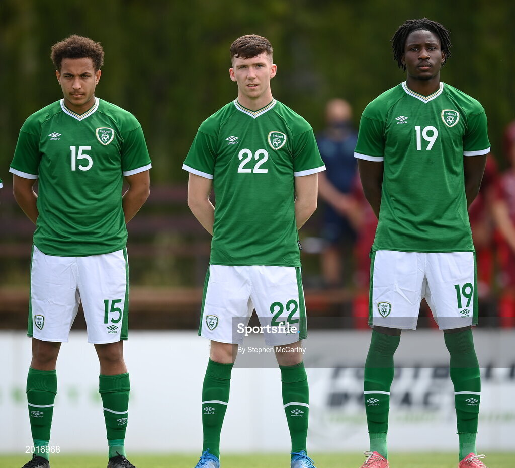 30 May 2021; Republic of Ireland players, from left, Lewis Richards, Conor Grant and Joshua Kayode before the U21 international friendly match between Switzerland and Republic of Ireland at Dama de Noche Football Centre in Marbella, Spain. Photo by Stephen McCarthy/Sportsfile