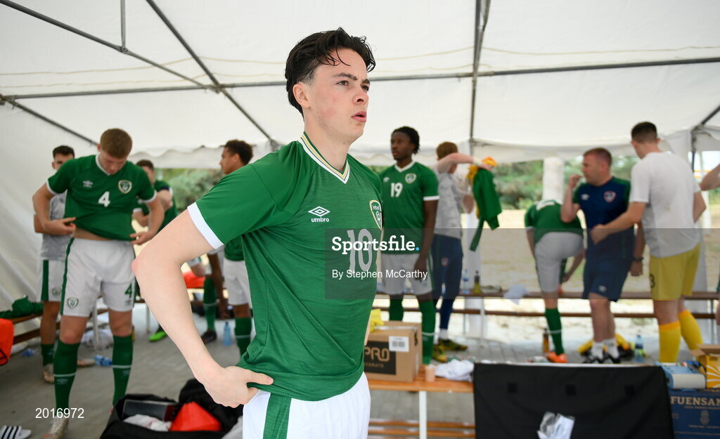 30 May 2021; Louie Watson of Republic of Ireland pulls on his jersey before the U21 international friendly match between Switzerland and Republic of Ireland at Dama de Noche Football Centre in Marbella, Spain. Photo by Stephen McCarthy/Sportsfile
