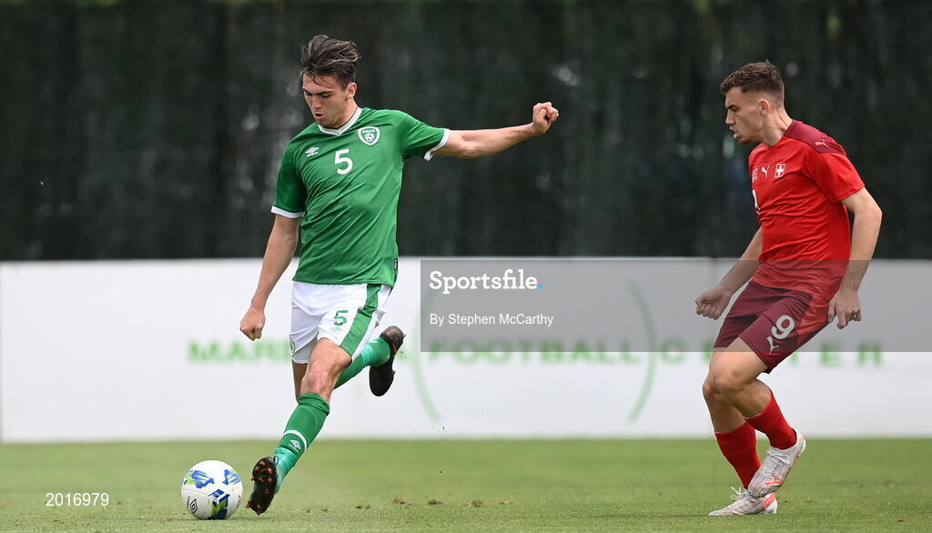 30 May 2021; Oisin McEntee of Republic of Ireland and Filip Stojilkovic of Switzerland during the U21 international friendly match between Switzerland and Republic of Ireland at Dama de Noche Football Centre in Marbella, Spain. Photo by Stephen McCarthy/Sportsfile