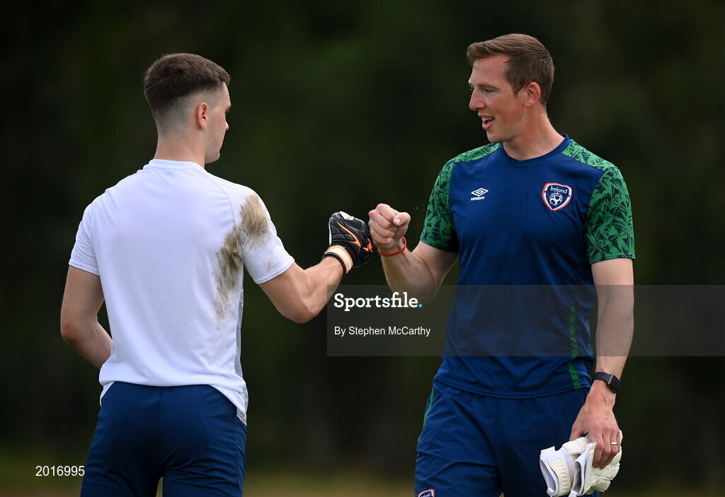 30 May 2021; Republic of Ireland goalkeeping coach Rene Gilmartin with goalkeeper Brian Maher before the U21 international friendly match between Switzerland and Republic of Ireland at Dama de Noche Football Centre in Marbella, Spain. Photo by Stephen McCarthy/Sportsfile