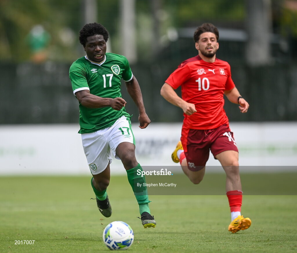 30 May 2021; Festy Ebosele of Republic of Ireland and Kastriot Imeri of Switzerland during the U21 international friendly match between Switzerland and Republic of Ireland at Dama de Noche Football Centre in Marbella, Spain. Photo by Stephen McCarthy/Sportsfile