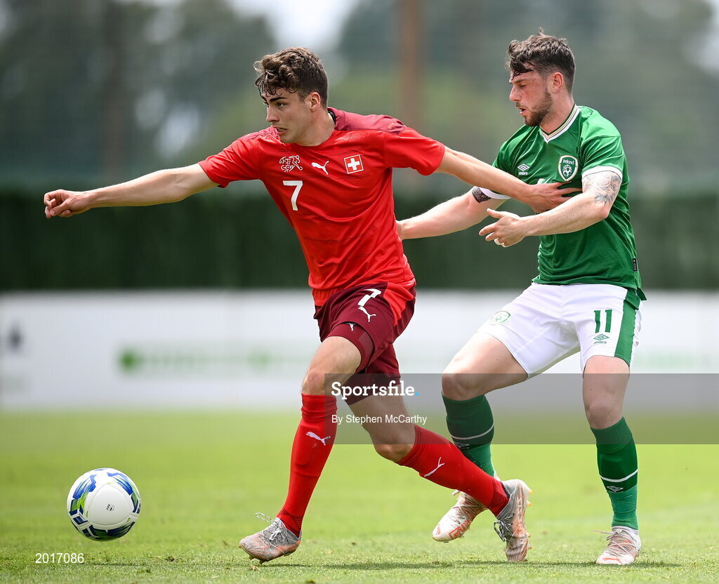30 May 2021; Tim Staubli of Switzerland in action against Will Ferry of Republic of Ireland during the U21 international friendly match between Switzerland and Republic of Ireland at Dama de Noche Football Centre in Marbella, Spain. Photo by Stephen McCarthy/Sportsfile