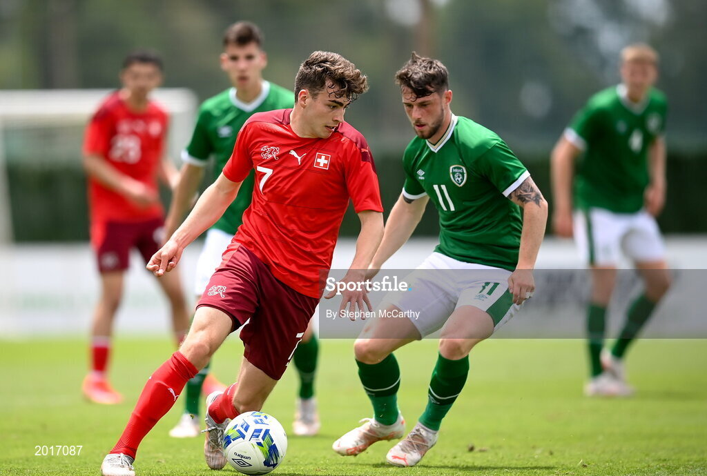 30 May 2021; Tim Staubli of Switzerland in action against Will Ferry of Republic of Ireland during the U21 international friendly match between Switzerland and Republic of Ireland at Dama de Noche Football Centre in Marbella, Spain. Photo by Stephen McCarthy/Sportsfile