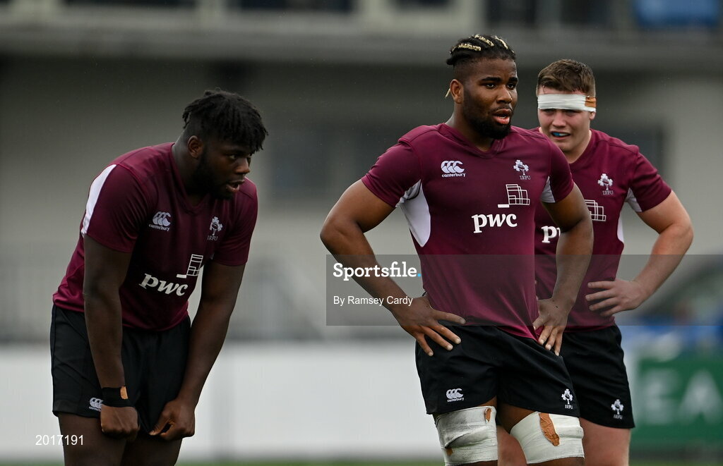 28 May 2021; Ireland U20 players, from left, Sam Illo, Daniel Okeke and Jack Boyle during the match between Ireland U20 and Leinster A at Energia Park in Dublin. Photo by Ramsey Cardy/Sportsfile