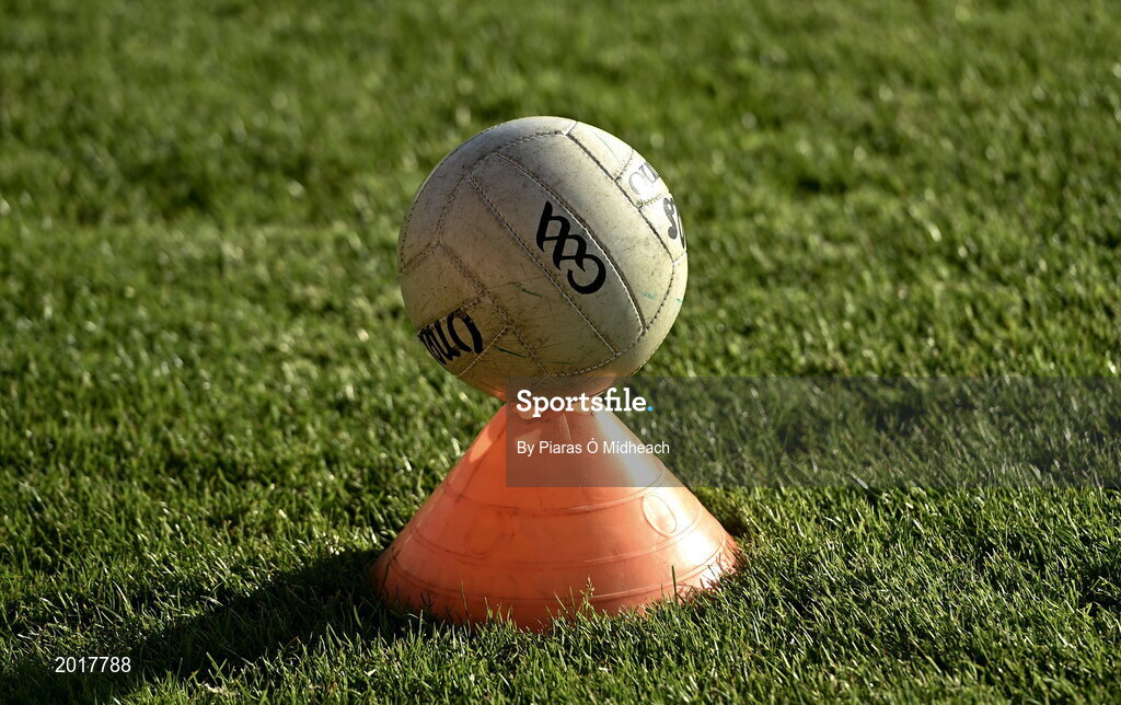 29 May 2021; A general view of a football on the pitch during the Armagh warm-up before the Allianz Football League Division 1 North Round 3 match between Armagh and Donegal at the Athletic Grounds in Armagh. Photo by Piaras Ó Mídheach/Sportsfile