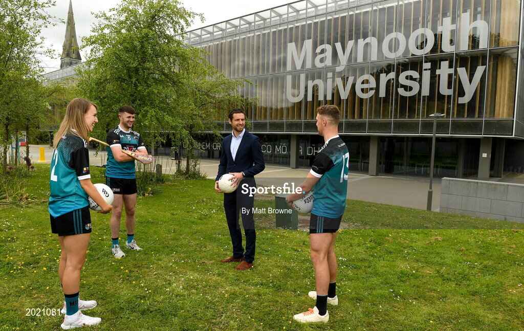 8 June 2021; Tom Parsons, recently appointed CEO of the GPA, pictured with, from left, Maynooth University GAA players Kilkenny hurler Conor Drennan, Meath footballer Mary Kate Lynch and Kildare footballer Shane O'Sullivan at the launch of the new scholarship agreement between the Gaelic Players Association (GPA) and Maynooth University. Under the agreement, four fully-funded scholarships will be available to inter-county players annually, with successful applicants to be known as ‘Maynooth University/GPA Scholars’. Photo by Matt Browne/Sportsfile