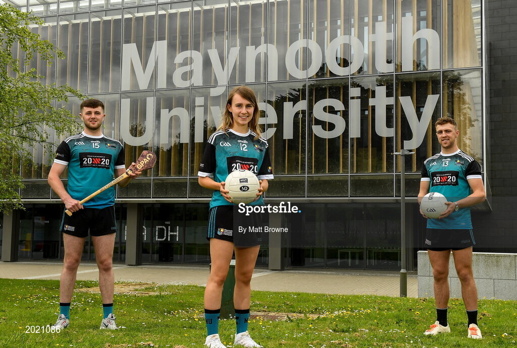 8 June 2021; Maynooth University GAA players Meath footballer Mary Kate Lynch with, from left, Kilkenny hurler Conor Drennan and Kildare footballer Shane O'Sullivan at the launch of the new scholarship agreement between the Gaelic Players Association (GPA) and Maynooth University. Under the agreement, four fully-funded scholarships will be available to inter-county players annually, with successful applicants to be known as ‘Maynooth University/GPA Scholars’. Photo by Matt Browne/Sportsfile