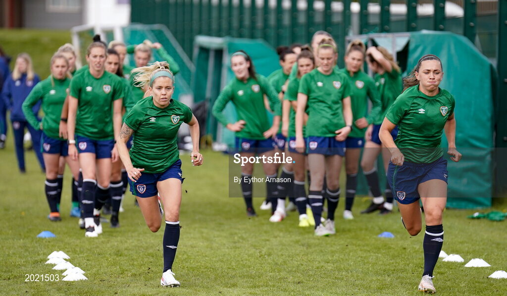 8 June 2021; Denise O'Sullivan and Katie McCabe, right, during a Republic of Ireland women training session at Versalavollur in Reykjavik, Iceland. Photo by Eythor Arnason/Sportsfile