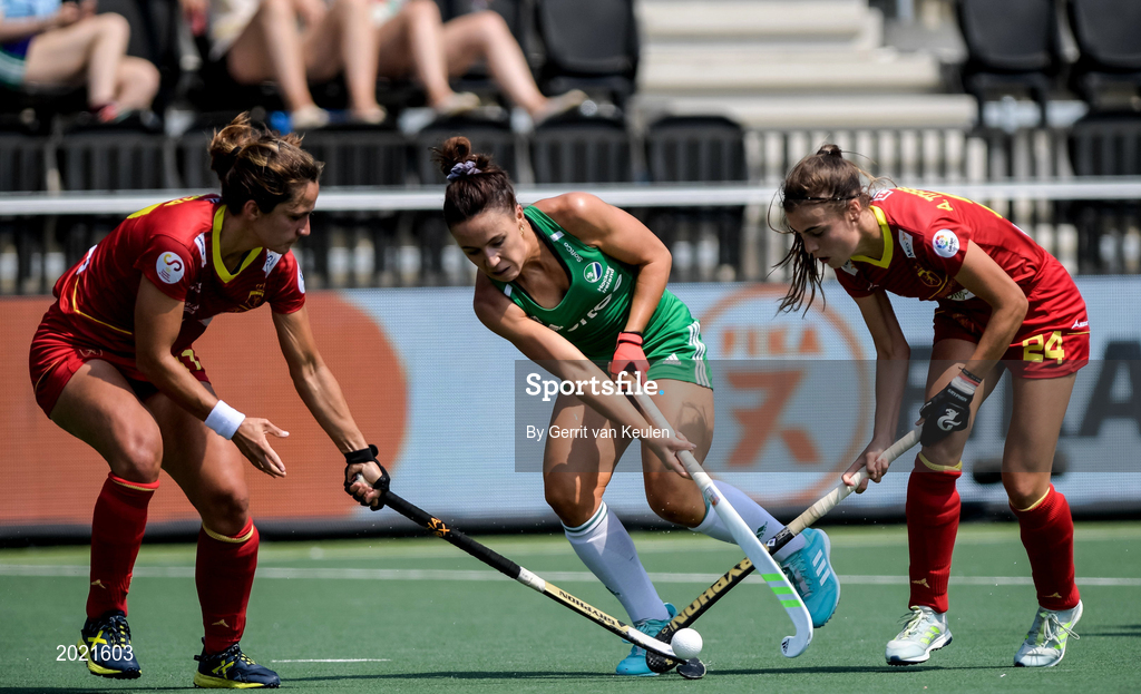 9 June 2021; Anna O'Flanagan of Ireland in action against Lola Riera, left, and Alejandra Torres-Quevedo of Spain during the Women's EuroHockey Championships Pool A match between Ireland and Spain at Wagener Hockey Stadium in Amstelveen, Netherlands. Photo by Gerrit van Keulen/Sportsfile